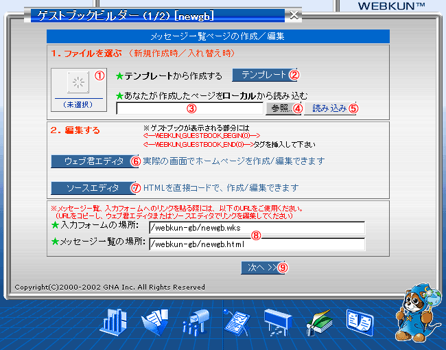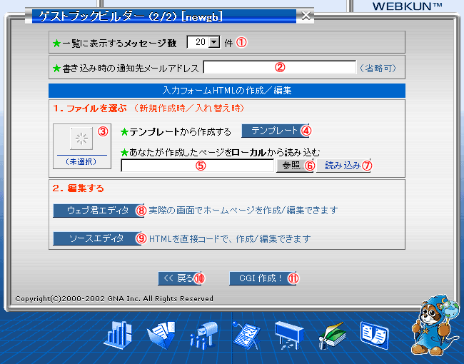 ※ウェブ君メニューバーのクローズボタンはゲストブックビルダーを終了し、トップページへジャンプします。