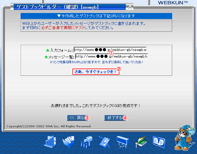 テストをして正常に動作していたら、「終了する」ボタン(4)をクリックし、ゲストブックビルダーを終了してください。