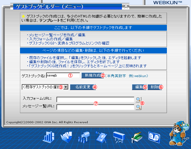 ゲストブックビルダーを開くと、最初にこのメニュー画面が表示されます。