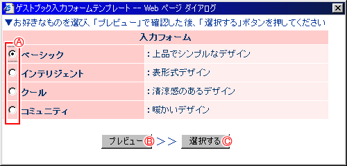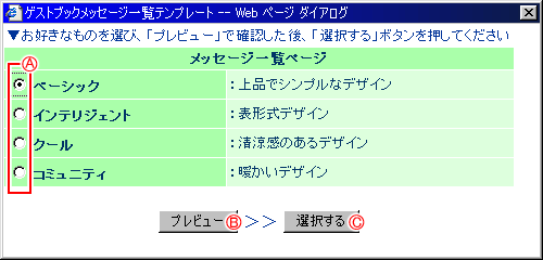 気に入ったテンプレート(A)を選び、「プレビュー」(B)で確認した後、「選択する」ボタン(C)をクリックしてください。