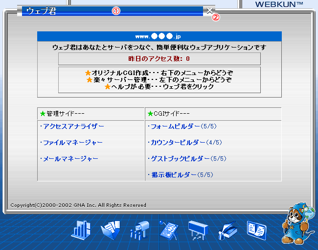 ウェブ君はブラウザからサーバにアクセスし、サイト管理、CGI作成、ホームページ編集が簡単に行える総合ツールです。