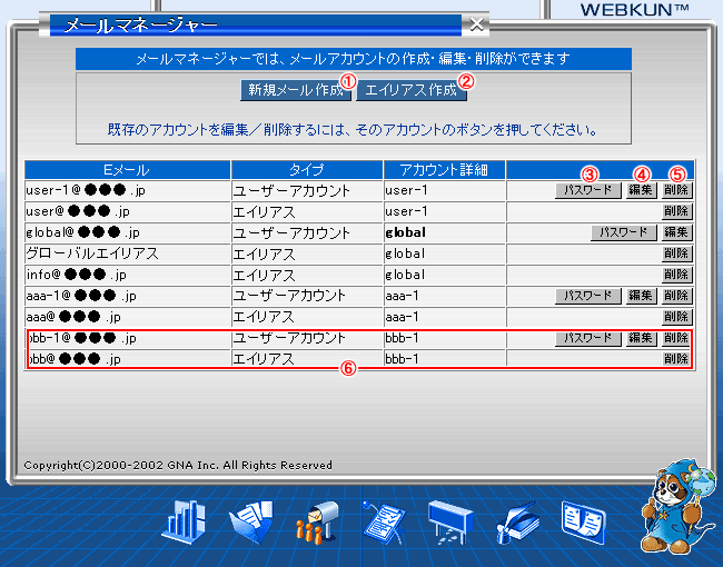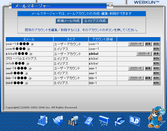 ユーザーアカウントを削除すると、そのユーザーアカウントのエイリアスも削除されますのでご注意ください。