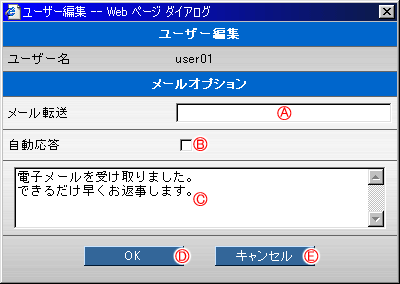 ユーザーアカウントの編集では、転送メール、自動返答メールなどのメールオプションの設定もできます。