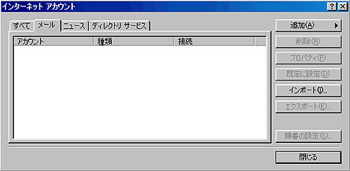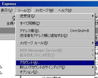 Outlook Expressを起動します。 1.メニューバーの「ツール」をクリックし、開いたメニューの「アカウント」をクリックします。 2.「インターネットアカウント」の画面が表示されます。 上の「メール」 タブをクリックし、新規にアカウントを設定します。 3.「インターネット接続ウィザード」が起動し、「表示名」を入力するテキストボックスが表示されます。