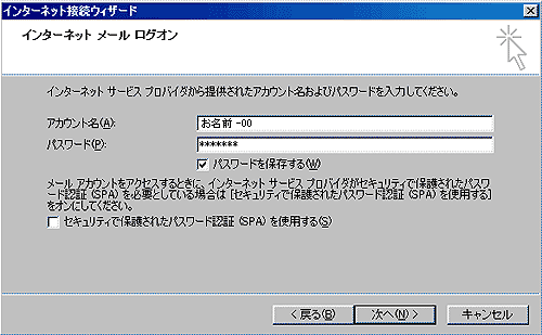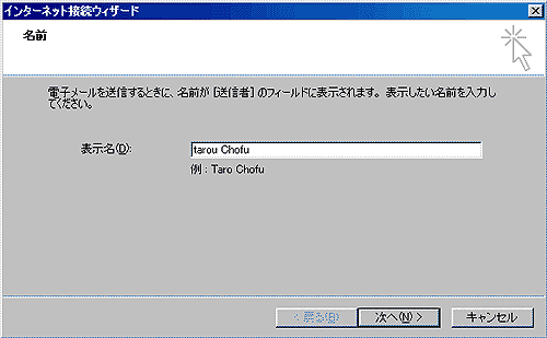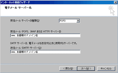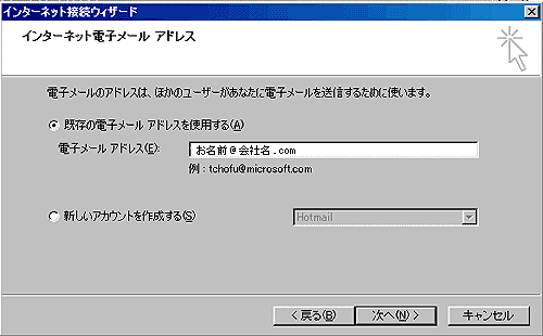 表示名はメール送信時に差出人名としてメールの中に表示されます。ニックネーム等でも結構です。 4.インターネット電子メールアドレスの入力画面が表示されます。 電子メールアドレスに、ご希望のメールアカウント(例:お名前@会社名.com)を入力します。 5.「電子メールサーバー名」の設定画面が表示されます。 受信メールサーバーの種類:POP3 注:お客様のご利用になっている接続プロバイダにより、上記の方法で設定できない場合があります。 設定ができたら、「次へ」をクリックしてください。 6.「インターネットメールログオン」画面が表示されます。