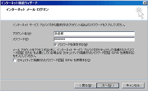 表示名はメール送信時に差出人名としてメールの中に表示されます。ニックネーム等でも結構です。 4.インターネット電子メールアドレスの入力画面が表示されます。 電子メールアドレスに、ご希望のメールアカウント(例:お名前@会社名.com)を入力します。 5.「電子メールサーバー名」の設定画面が表示されます。 受信メールサーバーの種類:POP3 注:お客様のご利用になっている接続プロバイダにより、上記の方法で設定できない場合があります。 設定ができたら、「次へ」をクリックしてください。 6.「インターネットメールログオン」画面が表示されます。