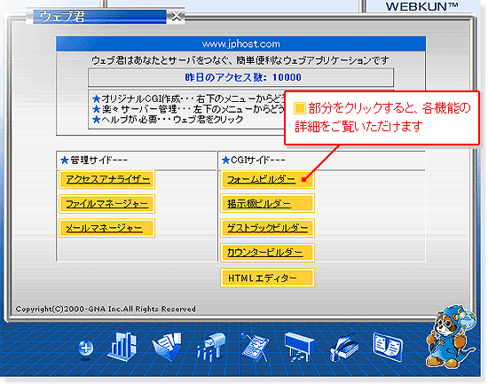 ウェブ君を起動すると、まずこのメインメニュー画面が表示されます。 ここから、ホームページの運営・管理、CGIの作成などを行います。